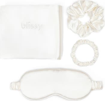 Get a blissful night's rest with this pure Mulberry silk sleep set that includes a pillowcase, sleep mask, and silk hair scrunchies.