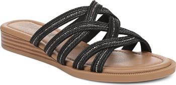 Bring SoCal spirit to a casual sandal featuring braided straps sparkling with rhinestone trim, a comfortably cushioned footbed and a mini wedge heel for a vacation-ready finish.