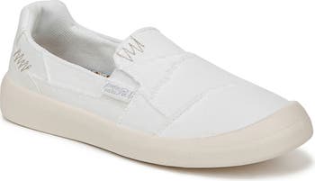 Frayed seams define the relaxed appeal of a lightweight canvas slip-on sneaker supported by a cushy footbed and a flexible grip sole.
