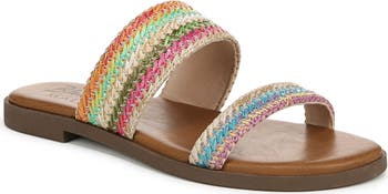 Dual woven straps in a pretty rainbow palette secure your foot in this summery slide that's an easy go-to for spending a day by the water.
