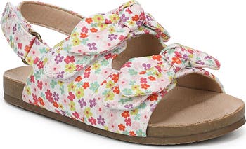 Allover florals and bow accents add fun flair to this double-strap sandal made for stylish little strides.