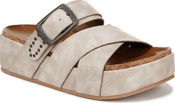 A chunky wedge and platform give a trend-forward finish to this slide sandal that boasts a strappy upper and a decorative buckle.