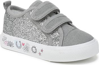 A glitter finish sweetens the sporty style of a low-top sneaker designed with a cushioned footbed and grippy sole to keep up with all-day play.