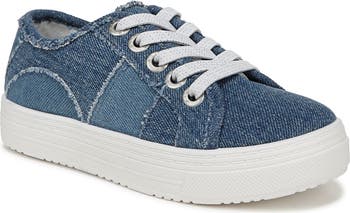 A patchwork of denim with frayed seams deliver a kid-friendly finish to a low-profile sneaker balanced on a chunky platform sole for a boost of style.