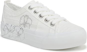 Floral embroidery charms the distressed canvas that shapes a laid-back sneaker with a casual low-top silhouette and bold platform sole.