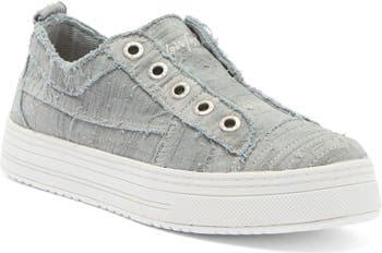 Frayed hems boost the bohemian appeal of a lace-less sneaker grounded by a bright platform sole.