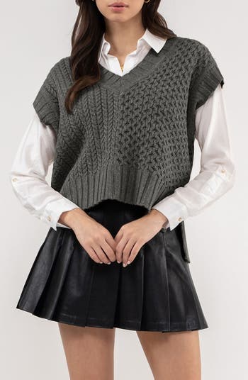 Love to layer this relaxed-fit V-neck vest that is knit in a charming cable pattern.