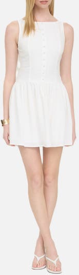 A slightly flared skirt adds easy, breezy movement to this drop-waist mini finished with a boat neck and covered button-half placket.