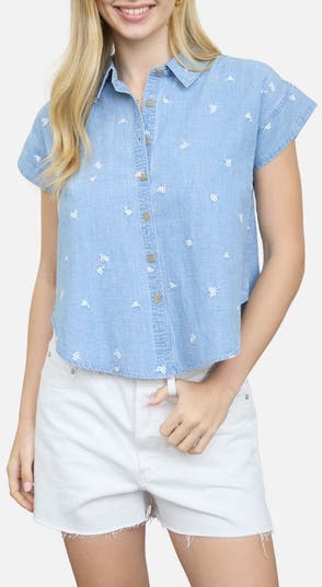 Sunny-day style comes easy in this floral-embroidered chambray button-up finished with extended sleeves and a curved hem.