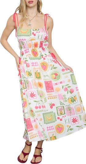 Show off your whimsy side with this midi-length dress covered in a patchwork of fruit motifs and styled with a shirred bodice.