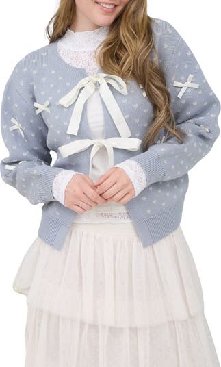 Dainty hearts and tacked bows sweeten this charming tie-front cardigan knit form soft cotton-blend yarns in a slouchy, cropped silhouette.