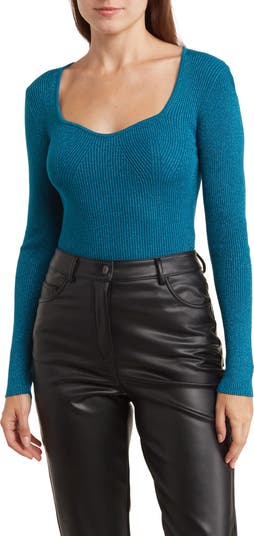 Shimmer from day to night in this metallic pullover sweater constructed from a stretchy ribbed knit in a fitted silhouette.