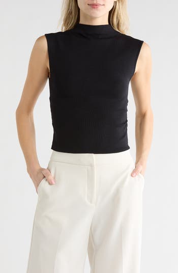 A mock neck and side ruching frame this solid sleeveless top that's perfect for a day or night out.