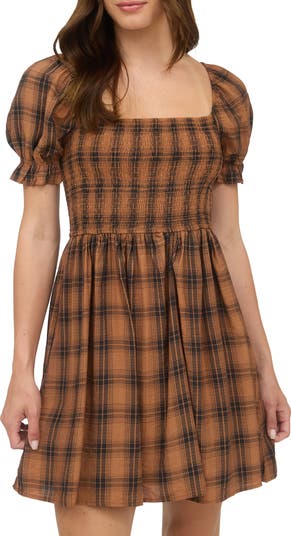 Turn on this charm in this plaid minidress fashioned with a smocked bodice, puff sleeves and a flirty flared skirt.