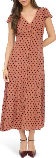 A whimsical print and polished silhouette define this midi dress styled with a button-front closure and short flutter sleeves that are perfect for sunny days.