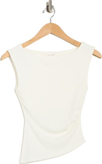 Allover ribbing texturizes a figure-flaunting top flanked by ruching on the left side to create a slightly asymmetric look.