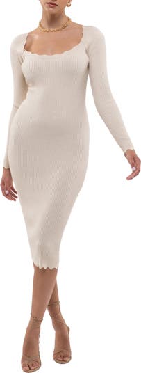 A soft and stretchy ribbed knit defines a romantic long-sleeve dress framed by a wavy scallop edge at every hem.