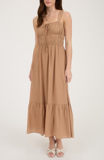 Scrunching the bodice gives a romantic shape to a charming midi dress complete with wide shoulder straps for a comfortable fit.
