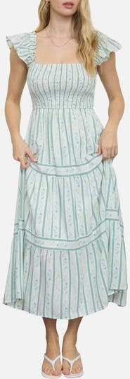 Ruffled cap sleeves, bodice smocking and pretty tiers make this floral-print midi dress a must-have.