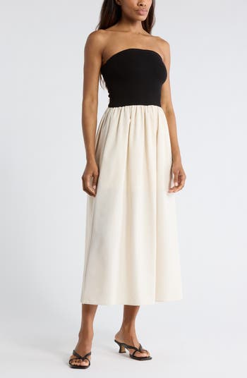 Chic colorblocking comes into play on this two-tone midi dress made with a knit tube-style bodice and a woven midi skirt.