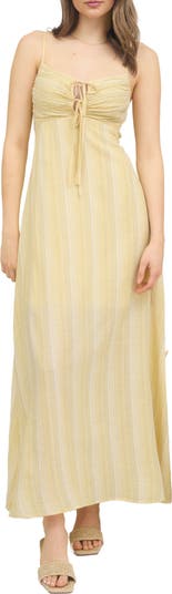 Soak up the sun in this striped Empire-waist maxi dress featuring dainty ties at the bust above a flowy A-line skirt.