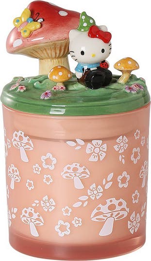 Decorate your home or office with this adorable Hello Kitty jar candle featuring a glossy ceramic lid depicting mushrooms and flowers.