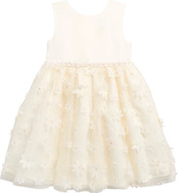 3D floral appliquès and a dramatically oversized satin bow at the back pack a party-perfect punch in this sleeveless dress embellished with faux pearls.
