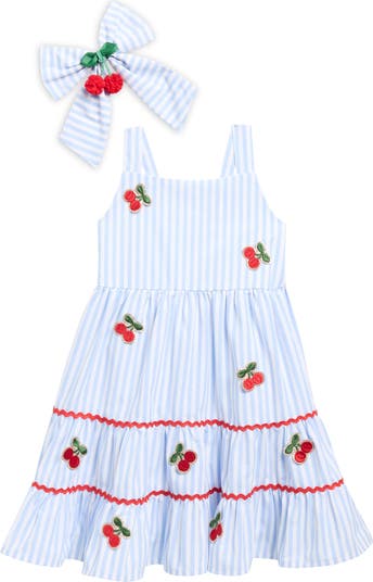 Playful cherry appliquès and scalloped rickrack trim contrast the crisp vertical stripes of this poplin sundress complete with a matching hair bow.