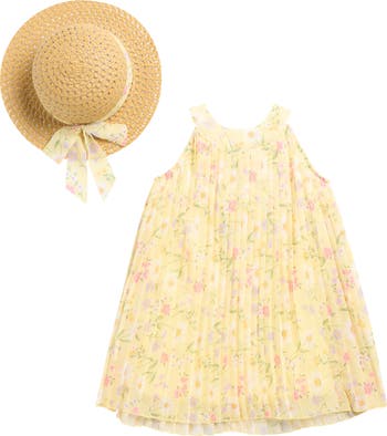 Your kiddo will be ready for warm-weather adventures in this pleated chiffon dress complete with a straw hat.