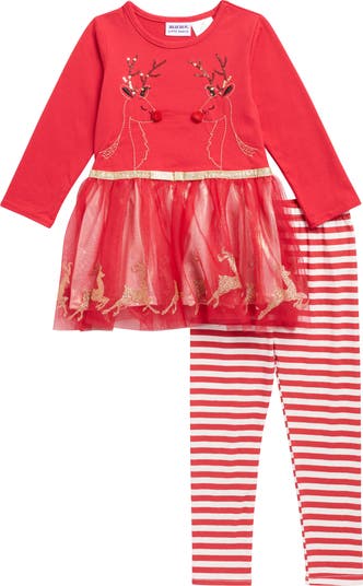 Give your kid festive shine with this reindeer-embellished long-sleeve skirted top and striped leggings set.