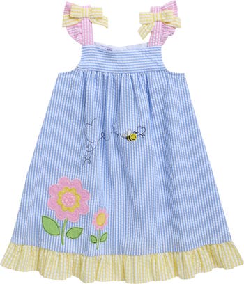 Your tiny trendsetter can take on sunny-day parties in this colorblocked seersucker dress embroidered with flowers and a playful bumblebee.