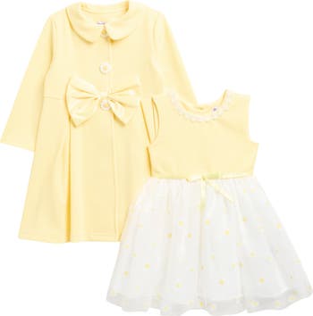 Little ones will be event ready in this adorable set that pairs a textured-knit coat with a matching tulle-skirt dress.
