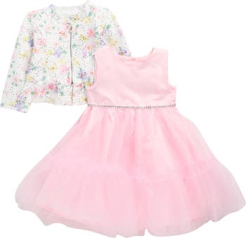 Your kiddo will be ready for your next special occasion in this set featuring a tulle-skirt dress and floral bouclé jacket.