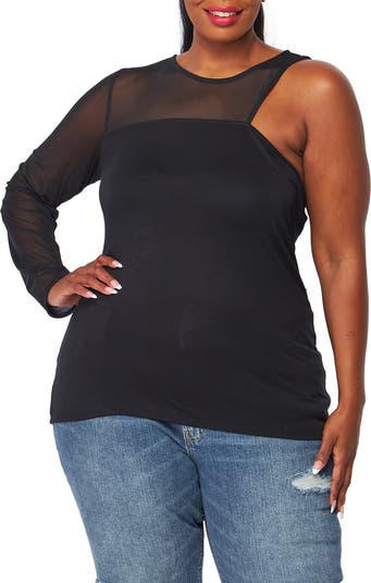 Show just the right amount of skin with a one-shoulder top with mesh detailing.