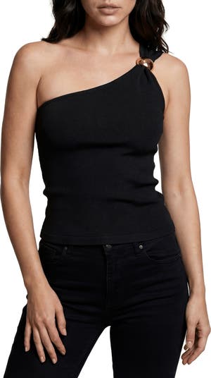 Show off your clavicles in this softly ribbed knit top styled with a one-shoulder neckline secured by a gleaming ring accent.