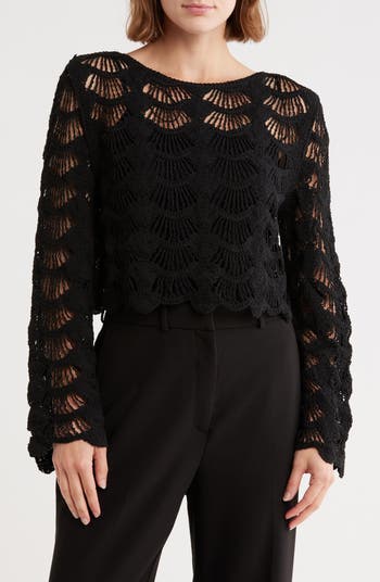 An openwork stitch lends visual interest to this crewneck sweater that makes a flirty choice for your night-out looks.