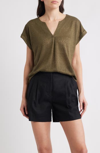 A sharp inverted pleat creates drapey movement on this soft knit top framed by cuffed dolman sleeves.