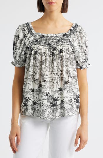 Get ready for the dreamy warmth of the season's sunny days in this peasant top that's framed by puff sleeves and patterned with a scenic tropical print.