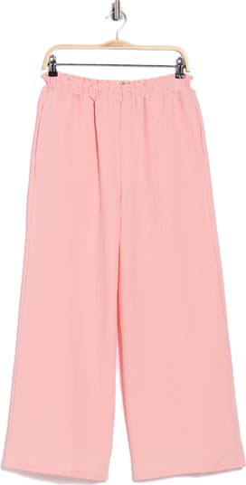 Brighten your day with these textured pull-on pants framed by a ruffled elastic waist and handy pockets.