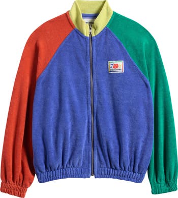 Mismatched colorblocking brightens a lightweight terry-cloth jacket made of organic and recycled fibers and sized to keep your kid moving comfortably whenever there's a chill in the air.