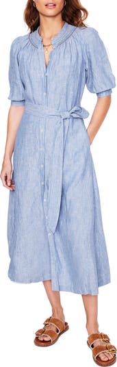 Embrace carefree sophistication any day of the week with this light-as-air cotton shirtdress featuring a matching belt and colorful embroidery at the collar.