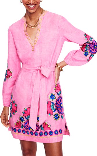 Cleo Floral Embroidered Tie Waist Long Sleeve Linen Dress