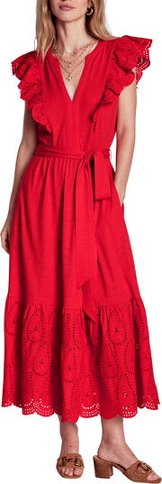 Eyelet embroidery and scalloped edges create a lacy effect on a tiered midi dress that's a contemporary-chic standout.