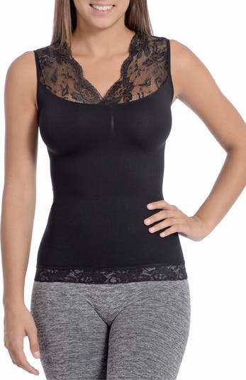A sultry lace trim outlines the V-neckline of a shaping camisole to slim your tummy underneath any outfit.