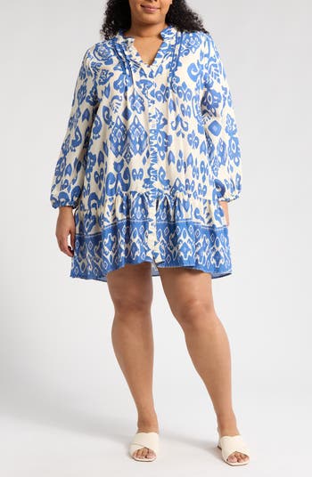 A bold ikat print brings vacation-ready appeal to breezy long-sleeve tunic with a versatile button-front closure.
