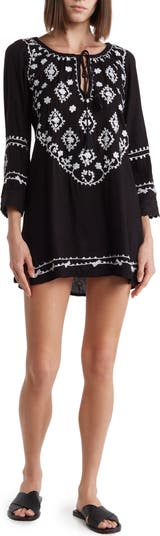Go from the beach to boardwalk in this flowy cover-up tunic fashioned with tassel ties, embroidered flowers and shimmering sequins for eye-catching style.