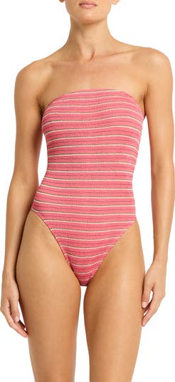 High legs lend beachy energy to this strapless one-piece swimsuit made with signature stretch and shimmery threads.