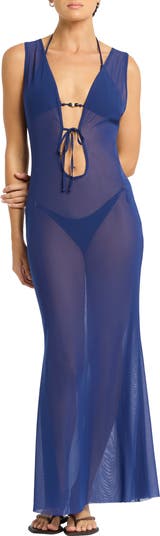 Effortlessly transition from beach to bar in this cover-up maxi made from airy sheer mesh and styled with a plunging tie neckline.