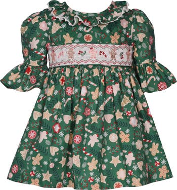 Holiday-ready and oh-so-cute, this gingerbread-printed dress features a matching smocked bodice and ruffle-trimmed sleeves for merry moments.