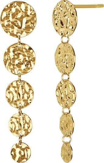 Adorn your lobes with these hammered disc drop earrings crafted from 14-karat gold that catches the light as you move.